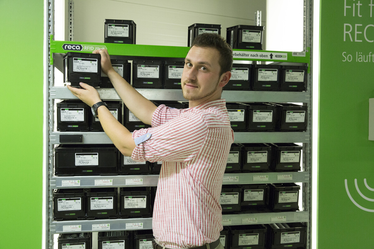 RECA RFID iBox служи като “интелигентен” пункт за събиране на празните контейнери KANBAN. Оттук нататък се генерира веднага нова поръчка. Когато в контейнера се постави празен контейнер, RFID транспондерът реагира: данните се предават незабавно към SAP системата на Kellner & Kunz.